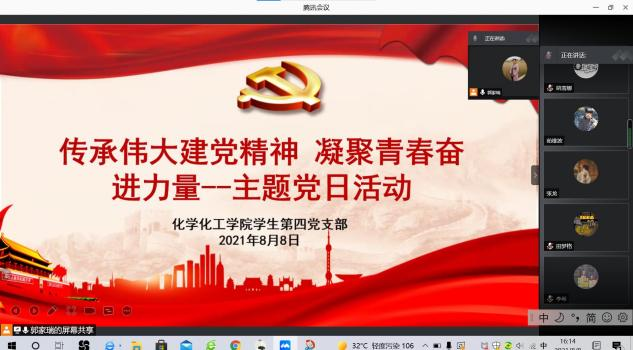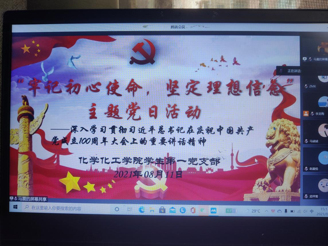 8月10日,化学化工学院学生第三党支部通过腾讯会议组织开展“永远跟党走”庆祝建党100周年主题党日活动,党支部书记史展首先带领全体党员深入学习了习近平总书记的重要讲话精神,引领广大同志听党话跟党走,做伟大事业的建设者、文明风尚的倡导者、敢于追梦的奋斗者,以实际行动向党的百年华诞献礼,为全面建设社会主义现代化国家贡献青春力量。其次,史展强调要在疫情仍在全球蔓延时期认真做好疫情排查工作,做到数据准确,及时做好防疫工作,做好自我保护。最后,支部全体党员表示,要始终坚持人民至上,立志为党分忧、为国尽责、为民造福,以实际行动诠释对党的忠诚之心、对人民的赤子之心。尤其是在这个疫情险峻的时刻,要全力以赴做好防控工作,树立高度的责任意识,打赢疫情防控狙击战。
