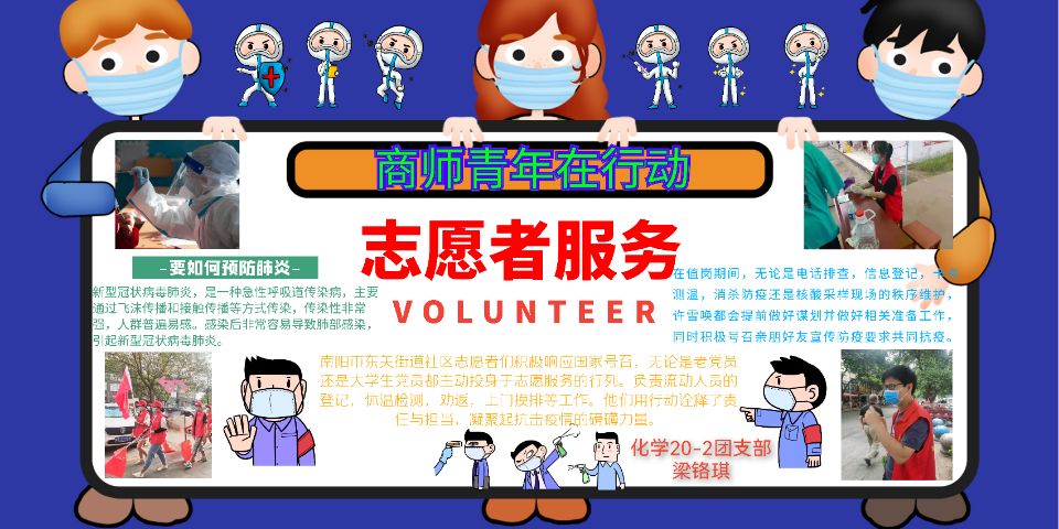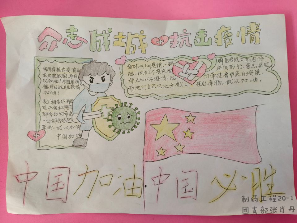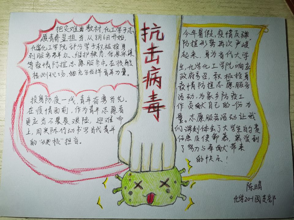 在抗击疫情的过程中,我们身边不乏感人的抗“疫”小故事,为了宣传学习他们的感人事迹,8月21日至29日,化学化工学院团总支于开展了“勇克时艰,为你点赞”抗“疫”志愿行手抄报、绘画、海报征集的线上主题活动。同学们纷纷以手抄报、绘画、海报的形式,积极展现身边的抗“疫”事迹,为身边的抗“疫”青年宣传打call。下面一起来看看优秀作品吧。