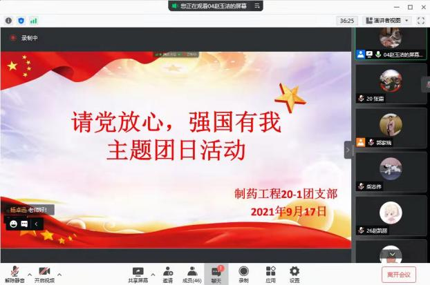 9月19日,制药20-1团支部在腾讯会议举行线上团日活动,此次活动由团支部书记赵玉洁主持,化学化工学院团总支副书记郭家瑞老师莅临本次团日活动。活动中,赵玉洁带领大家学习了习近平总书记“七一”重要讲话,邀请三位优秀团员青年代表分享了防汛抗疫志愿服务活动体会,之后共青团员集体献词朗诵,郭家瑞给大家上了“青春无悔 强国有我”微团课。
