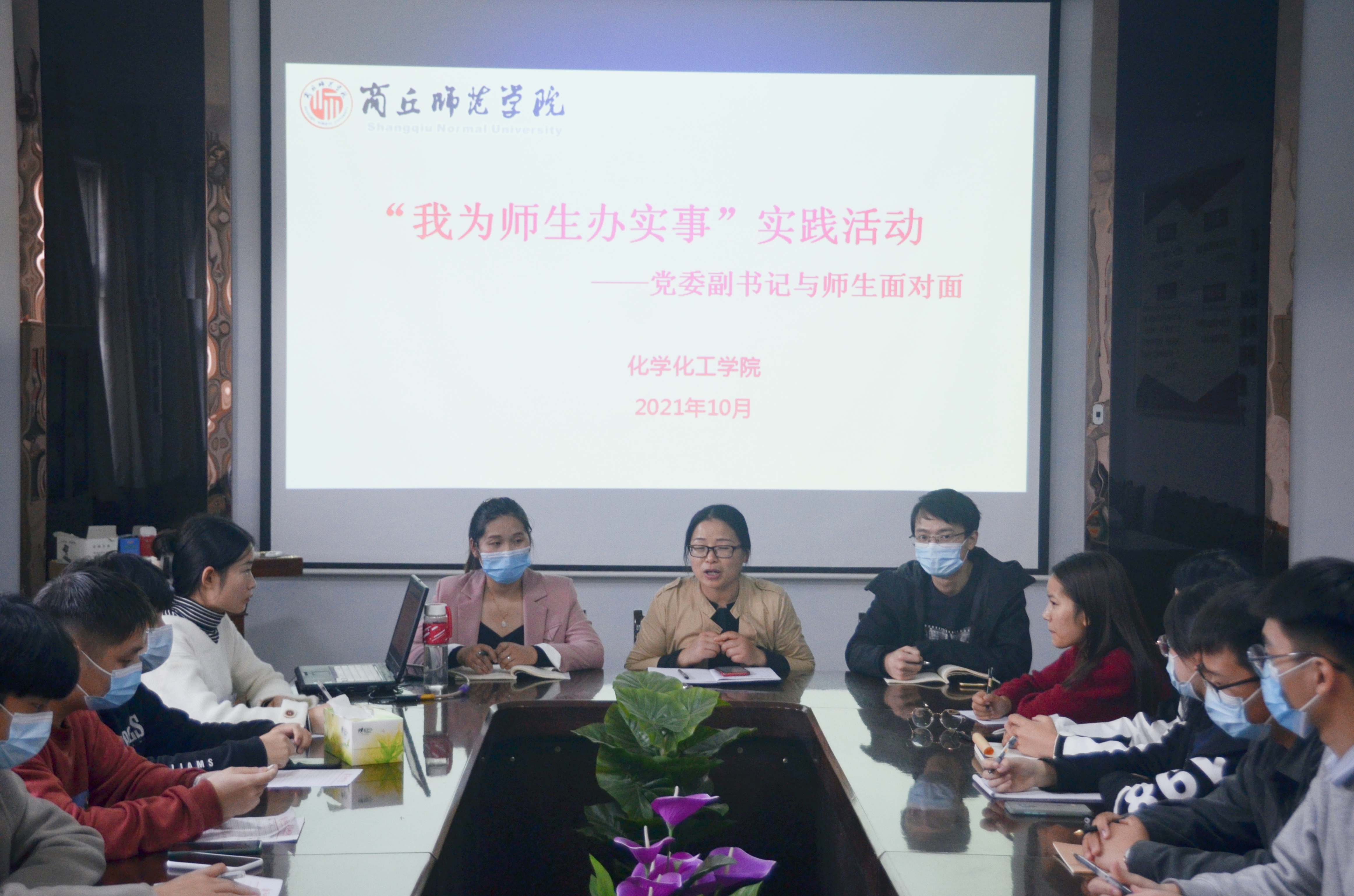 为号召广大师生学党史、悟思想、办实事、开新局,将党史学习教育与服务师生相结合,10月13日下午5点,化学化工学院于睢阳校区七号楼会议室召开“我为师生办实事”实践活动。党委副书记张颜梅主持,学工办副主任史展、辅导员李宁娅以及19级、20级班委参加。