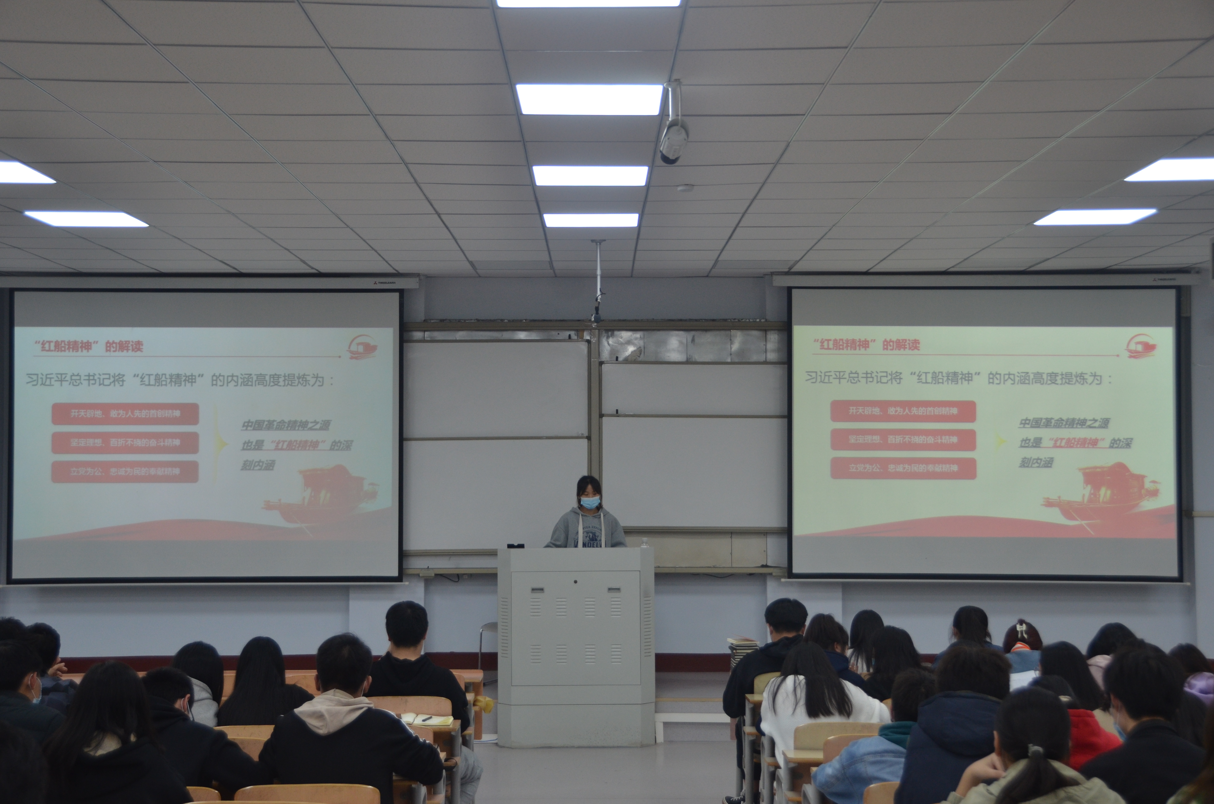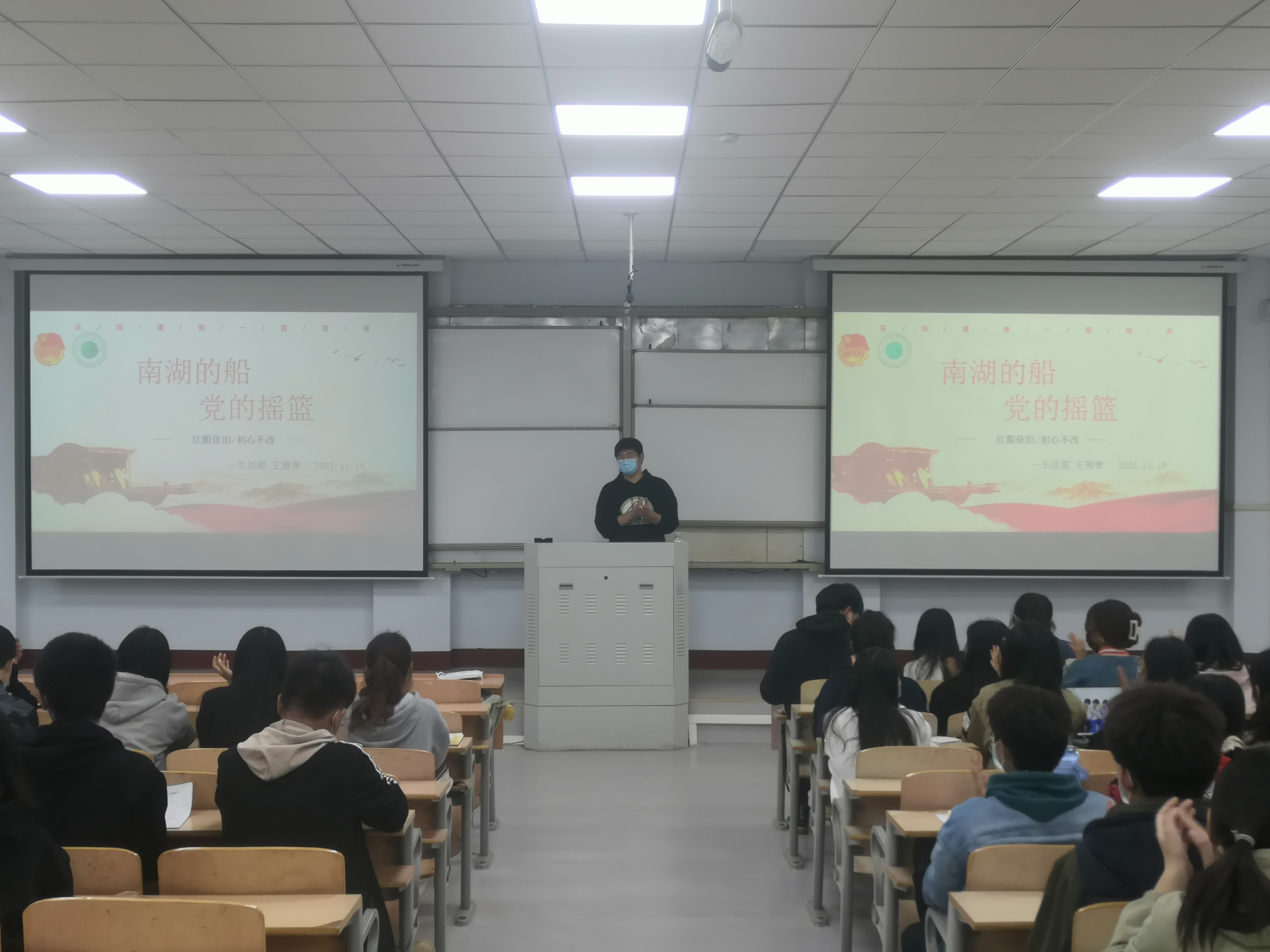 会议开始,学生会生活部负责人王雅青通过对中共十一大的召开,南湖精神的讲解,带领全体成员了解中国共产党的革命历史。通过对红船精神的解读,缅怀和追忆那段革命历史和伟大征程。会议最后,王雅青向同学们发出号召,希望同学们能够不忘初心,勇担重任,为新时代中国谱写一段佳话。