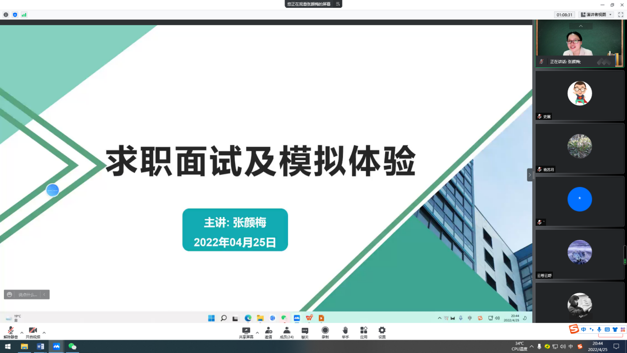 为增强2022届预毕业生求职面试应对能力,4月25日,化学化工学院利用腾讯会议开展了《求职面试及模拟体验》讲座,院党委副书记张颜梅主讲,2022届预毕业生参加。