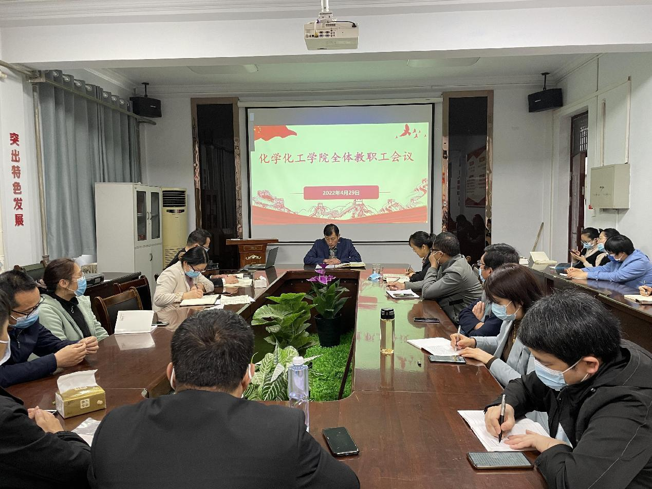 4月29日下午,化学化工学院通过线上线下相结合的方式举行全体教职工会议,会议由党委书记李海涛主持。