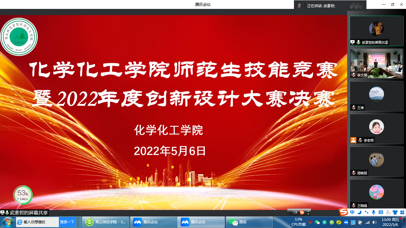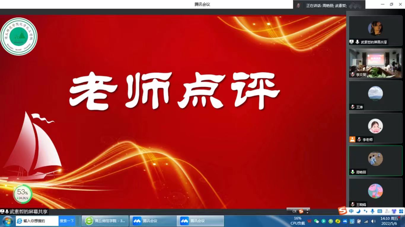 为提升化学师范生教育教学能力,提高PPT创新设计能力,5月6日,化学化工学院于睢阳校区7#104会议室举行了化学专业师范生技能竞赛暨2022年度PPT创新设计大赛决赛。院党委副书记张颜梅、副院长周艳丽、副院长王涛及专业评委老师出席本次活动。