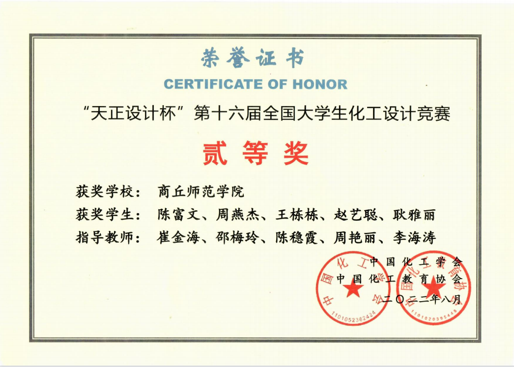 近日,由中国化工学会、中国化工教育协会举办的第十六届“天正设计杯”全国大学生化工设计竞赛在华东理工大学落下帷幕。永利23411集团学子陈富文、周燕杰、王栋栋、赵艺聪、耿雅丽组成的代表队在崔金海、邵梅玲等老师的指导下,经过半年多时间的努力,在作品设计和答辩中脱颖而出,荣获全国二等奖。