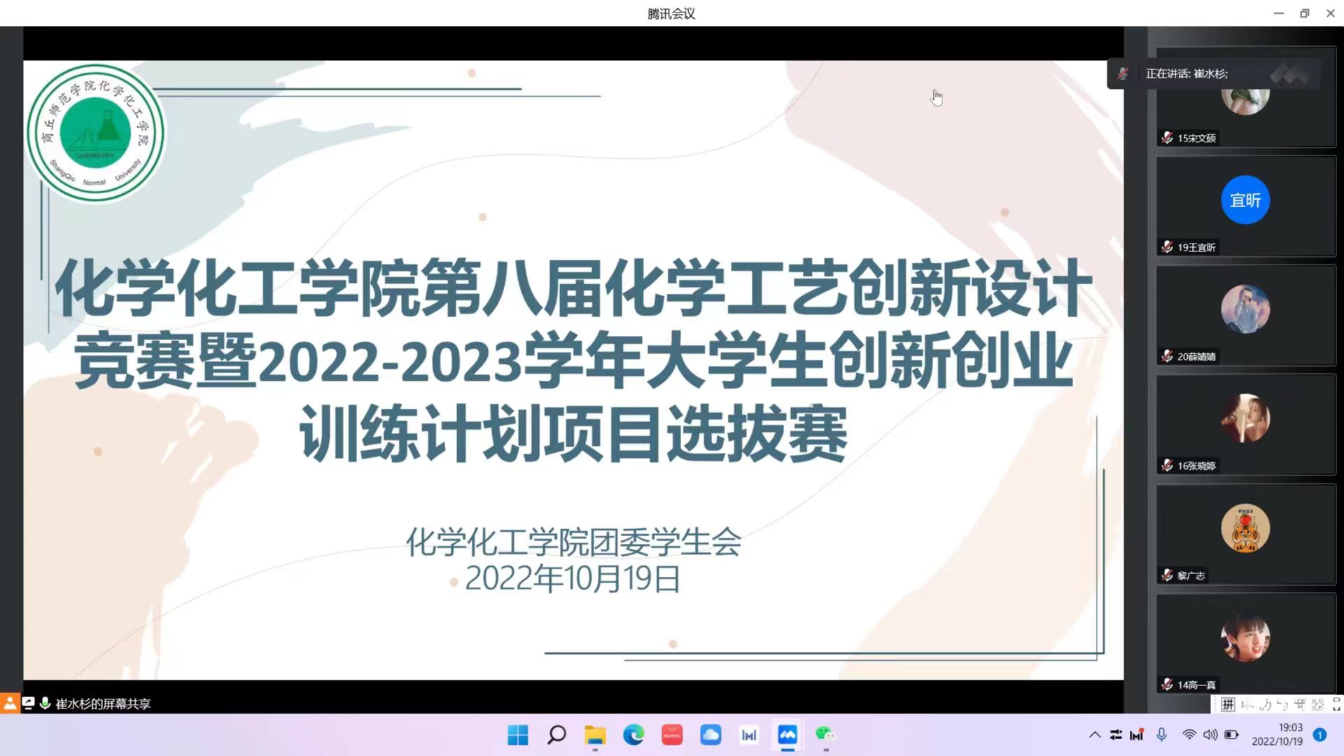 为增强大学生发现问题、分析问题和解决问题的能力,培养大学生的创新意识、创新能力和创新精神,对专业知识进行系统提升,培养工艺设计理念,培养团队协作精神。10月19日,化学化工学院通过线上线下结合的方式举行了第八届化学工艺创新设计竞赛暨2022-2023学年大学生创新创新训练计划项目选拔赛。