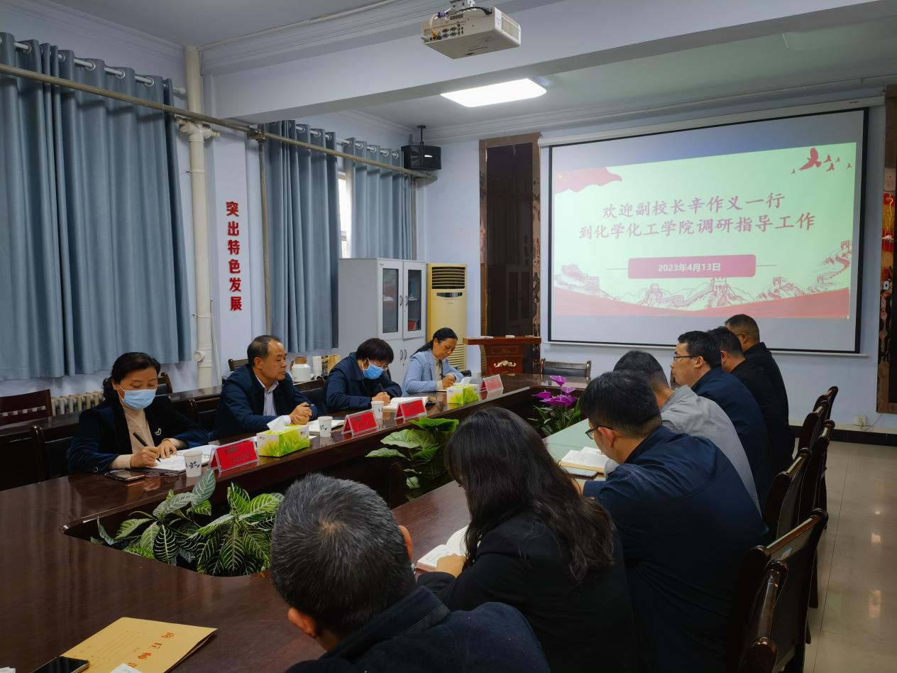 根据学校党委《关于在全校党员中深入开展学习贯彻习近平新时代中国特色社会主义思想主题教育的实施方案》精神,4月13日,副校长辛作义带领财务处处长方瑞华、国有资产管理处处长姚晓惠、人事处副处长朱金凤一行到化学化工学院调研指导工作。化学化工学院党委书记李海涛、院长张银堂、副院长王涛,科研平台、化学实验教学中心、党政办公室相关负责人参与座谈会。会议由李海涛主持。