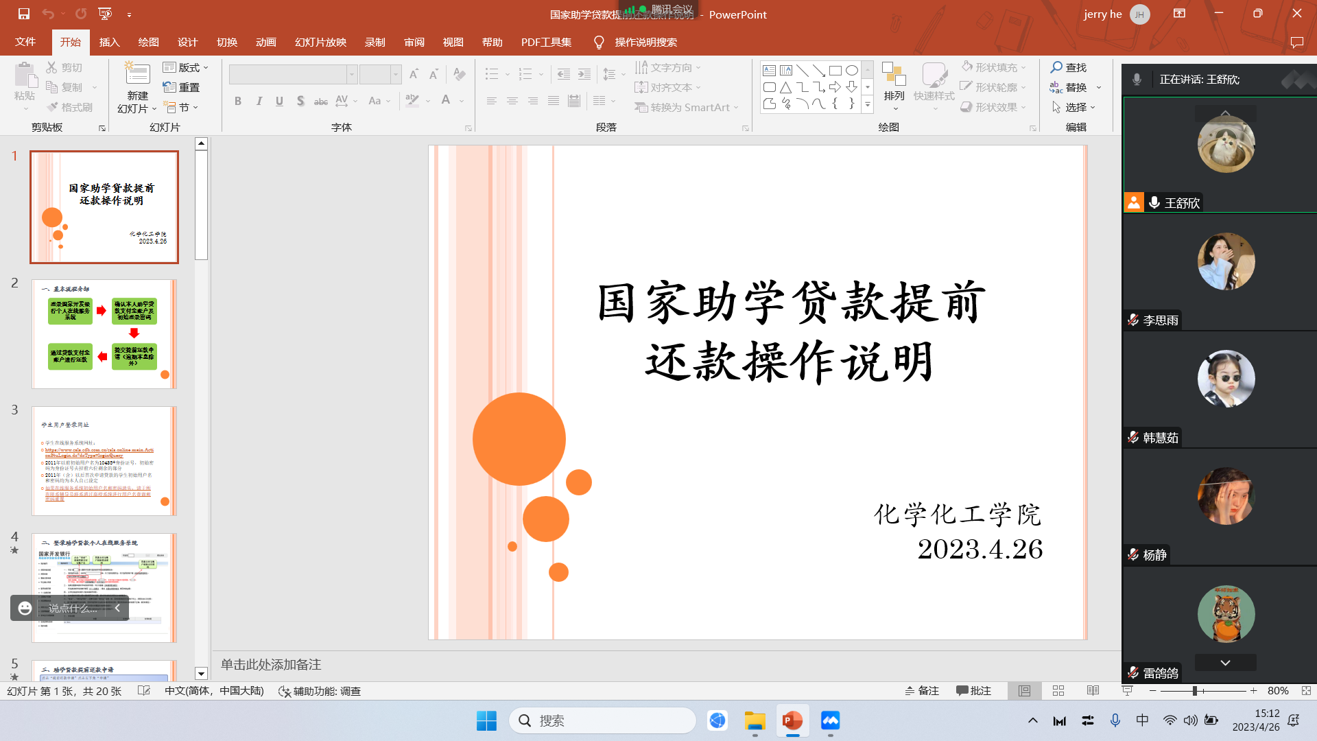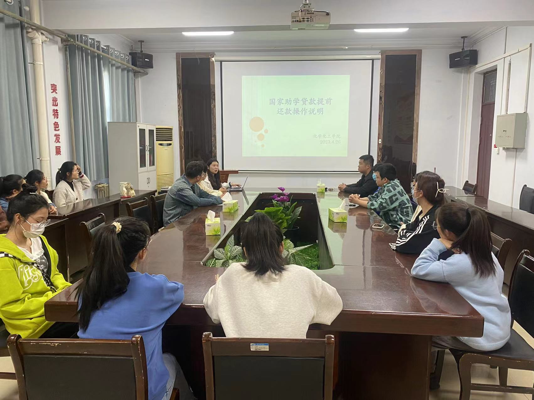 为帮助贷款毕业生了解还款流程,树立诚信还款意识,2023年4月26日,化学化工学院在学院会议室召开2023届毕业生还款教育会议,会议以线上线下相结合的形式进行,确保每位贷款学生了解还款事项及还款流程,会议由学院资助工作负责人王舒欣老师主持,2023届贷款毕业生参加会议。