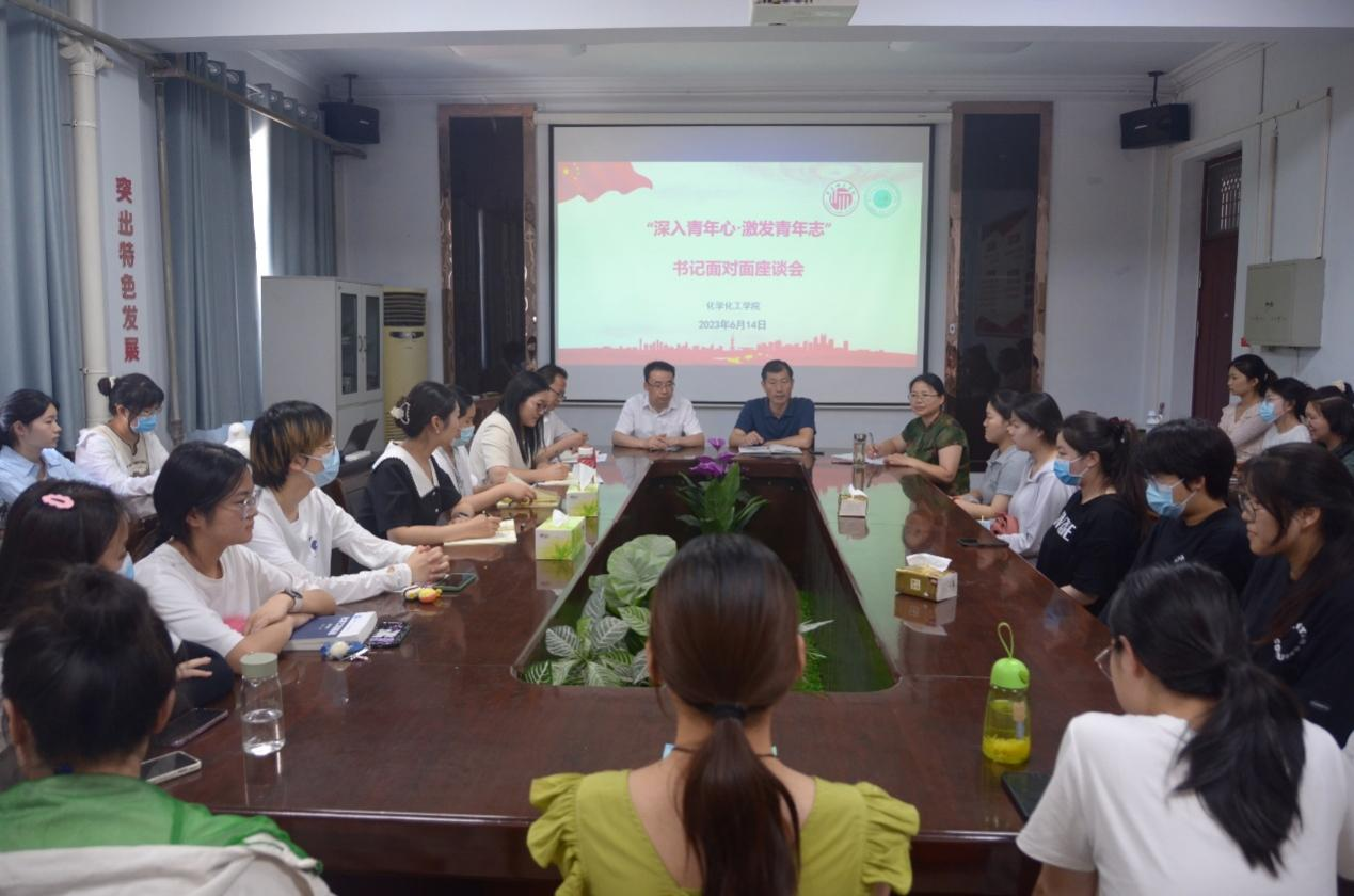 为深入学习贯彻习近平新时代中国特色社会主义思想主题教育,深入了解学生学习、生活状况,倾听学生心声,根据主题教育大兴调查研究之风要求,6月14日,化学化工学院于7号楼会议室召开了深入“深入青年心·激发青年志”书记面对面座谈会,化学20-4班全体学生参加了座谈会,院党委书记李海涛、院长张银堂、党委副书记张颜梅、副院长王涛及各年级辅导员出席。座谈会由李海涛主持。