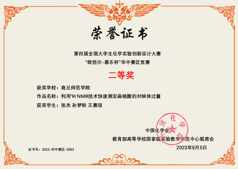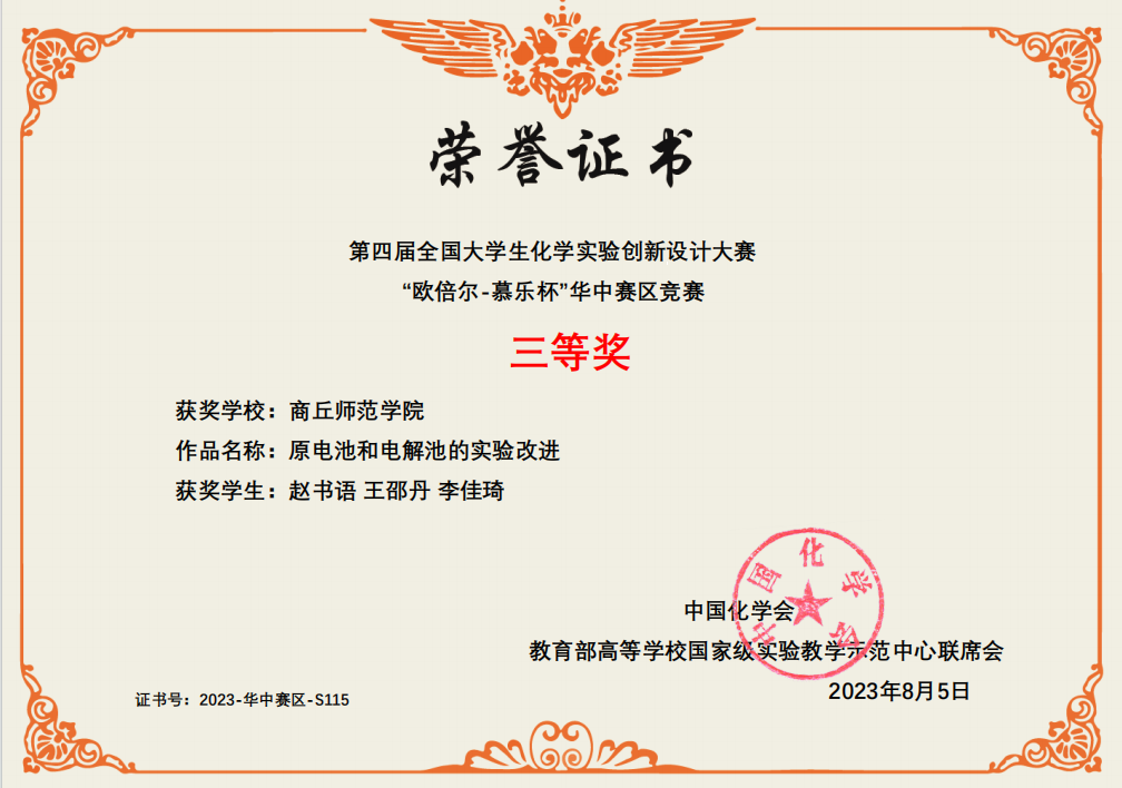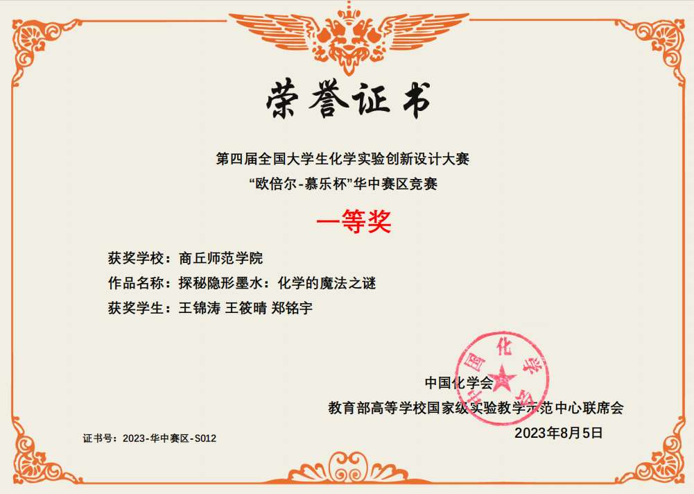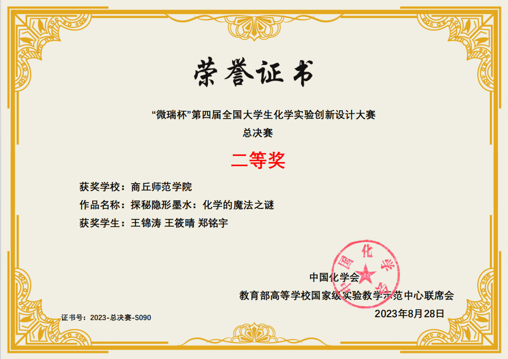 本次大赛从校赛算起,前后历经半年。永利23411集团选送参加本届华中赛区竞赛的三支队伍在学院的精心组织、指导教师的全力指导和参赛同学们的努力拼搏下,王筱晴、王锦涛、郑铭宇组成的团队(指导教师:陈淑敏,王晓娟)通过科普实验项目“探秘隐形墨水:化学的魔法之谜”荣获华中赛区竞赛一等奖;张杰、孙梦盼、王赛琼组成的团队(指导教师:王晓娟,高媛媛)通过新创实验项目“(S)-二苯基脯氨醇为NMR手性分析试剂测定扁桃酸的对映体纯度”荣获华中赛区竞赛二等奖;赵书语、李佳琦、王邵丹组成的团队(指导教师:王鑫,王涛)通过改进实验项目“原电池和电解池的实验改进”荣获华中赛区竞赛三等奖。其中,科普实验项目入围全国总决赛。