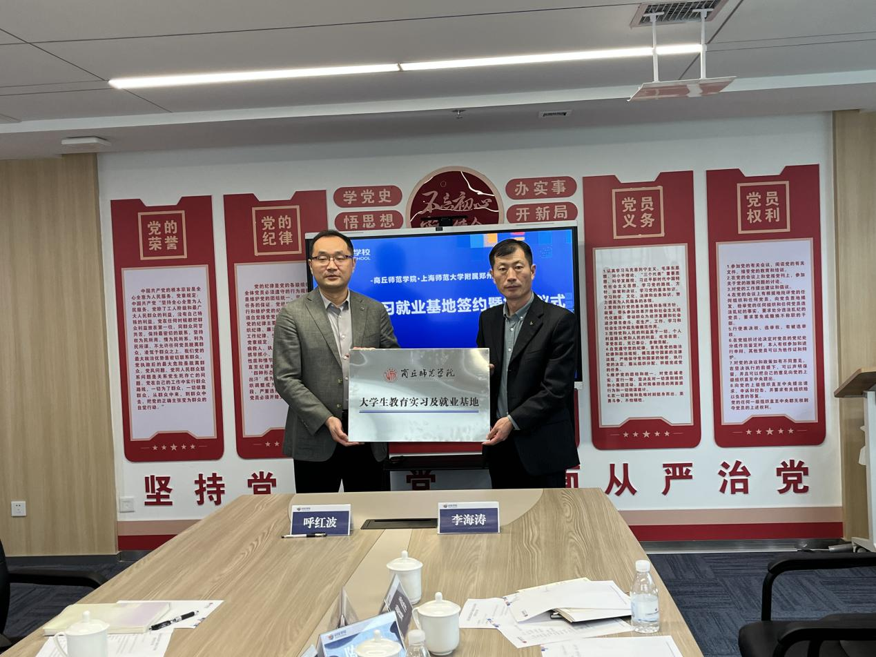 在上海师范大学附属郑州启佳初级中学,李海涛一行在呼红波校长和学校负责人陪同下,一起看望了学院正在实习的学生,并参观考察了学校校园环境、教学场所、实习场所等,详细了解了学校的办学思想和办学业绩。随后双方进行了大学生教育实习及就业基地的签约与授牌仪式。
