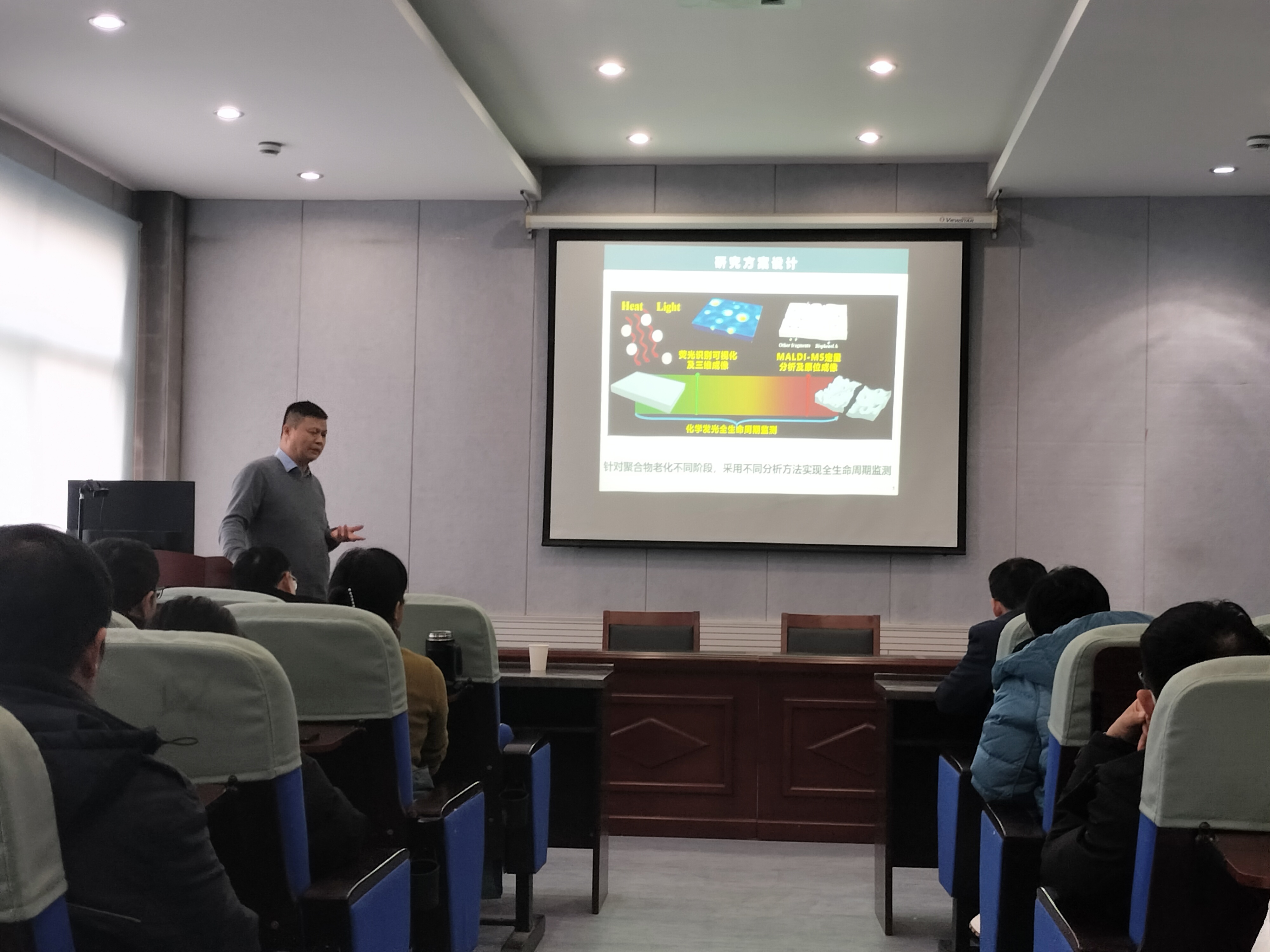 吕超教授以电缆材料、聚乙烯材料以及文物等老化为切入点,讲述了针对聚合物老化的不同阶段,在聚合物老化羟基早期荧光检测及过程检测、聚合物老化产物质谱检测及成像分析、聚合物老化路径化学发光监测及调控、聚合物老化早期荧光分析产业化应用以及应用前景等五个方面系统的介绍了课题组所开展的研究工作以及取得的成就。