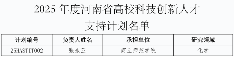 近日,河南省教育厅下发了《关于公布2025年度河南省高校科技创新团队和创新人才支持计划名单的通知》(教科技〔2024〕354号),我校化学化工学院张永亚博士成功获批创新人才项目支持。