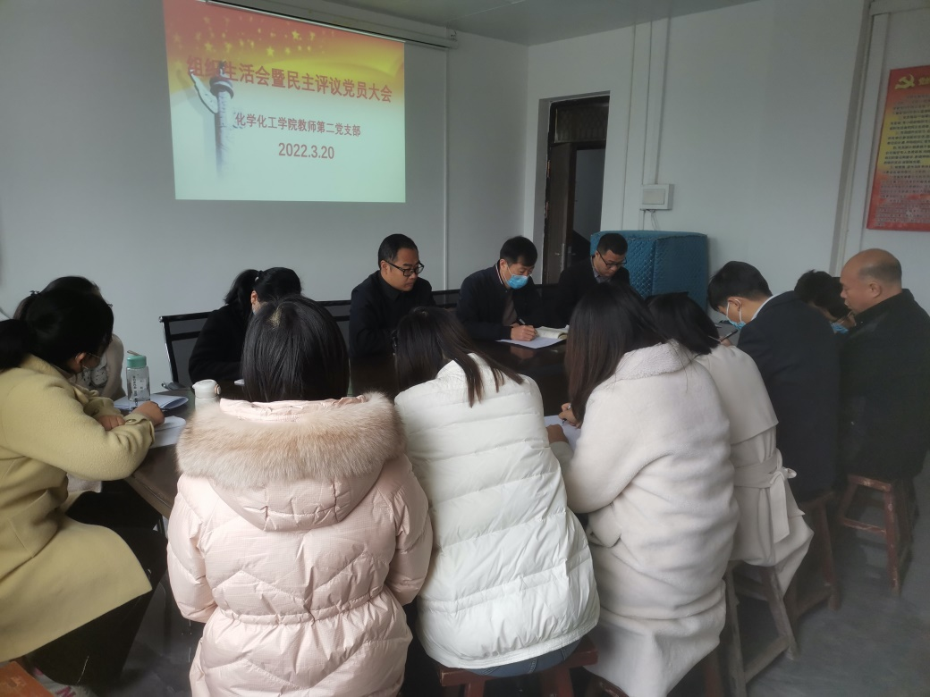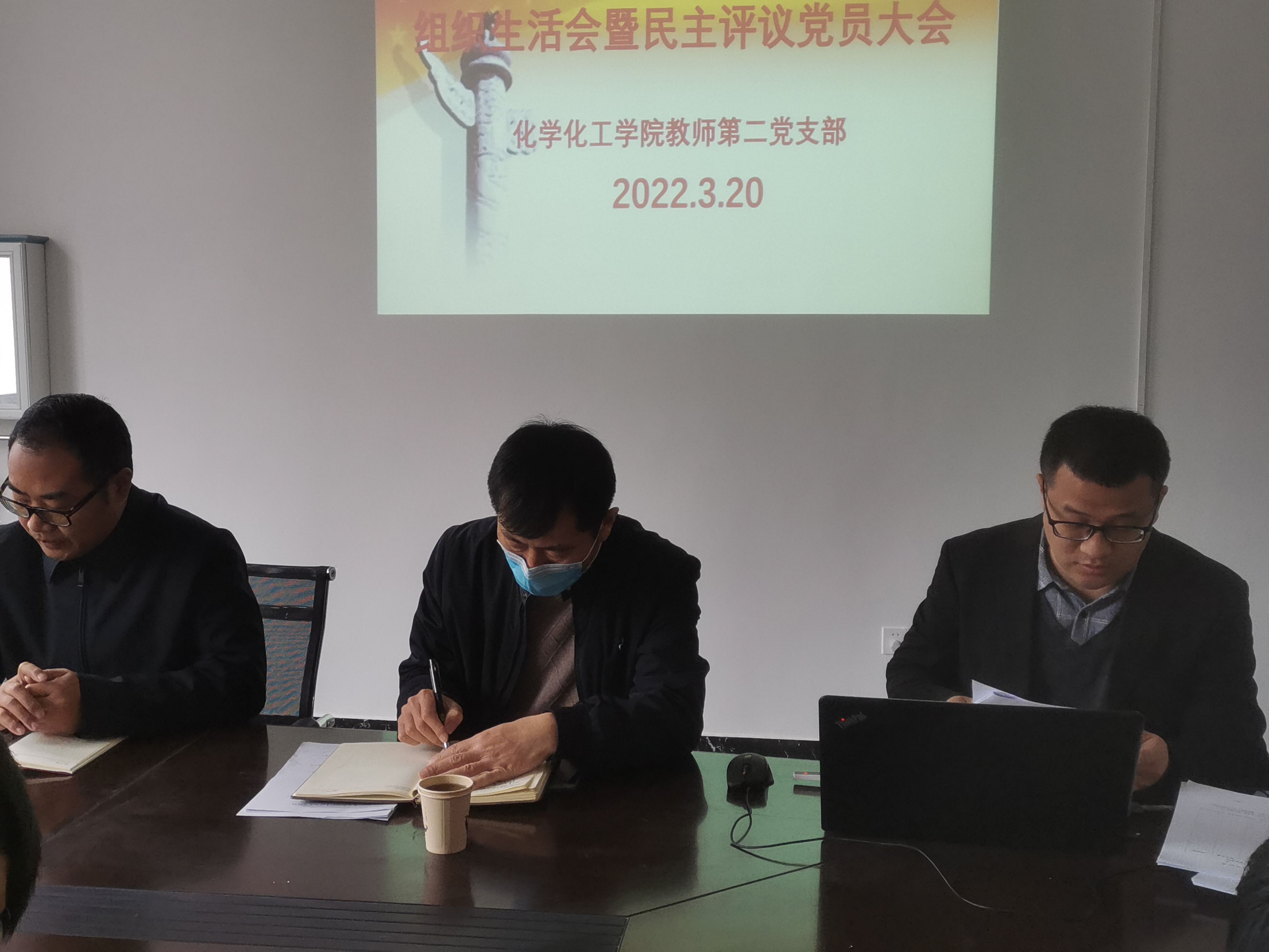 3月20日上午,化学化工学院教师第二党支部召开组织生活会并进行了2021年度党员民主评议工作。院党委书记李海涛同志及支部全体成员参加了会议,会议由支部书记胡新成同志主持。