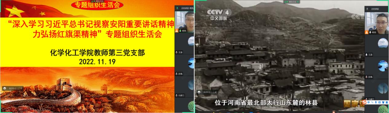 为深入学习贯彻党的二十大精神和习近平总书记视察河南安阳重要讲话精神,深刻领会红旗渠精神,增强基层党组织的凝聚力和战斗力,11月19日,教师第三党支部在线举行“深入学习习近平总书记视察安阳重要讲话精神,大力弘扬红旗渠精神”专题组织生活会,本次活动由支部书记张明亮同志主持,副院长王涛和本支部全体党员同志参加了此次会议。