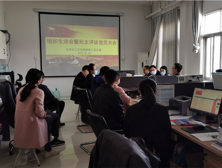 为深入学习贯彻习近平新时代中国特色社会主义思想并提升基层党组织政治功能和组织力,化学化工学院教师第三支部于3月9日在实验楼416办公室召开2021年度组织生活会暨民主评议党员大会。会议由支部书记张明亮主持,化学化工学院副院长王涛出席,支部全体党员参加。