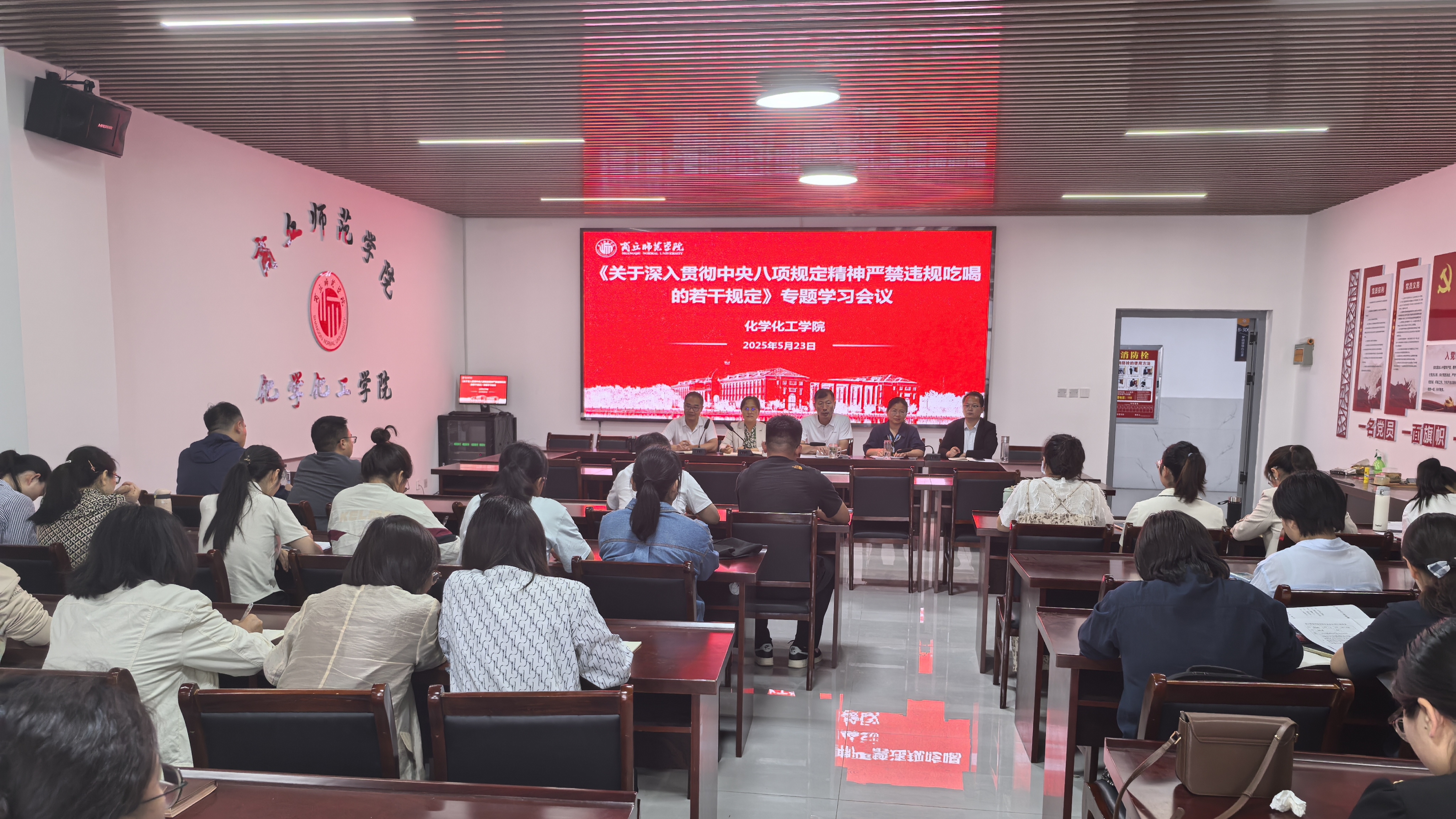 为深入贯彻落实中央八项规定精神,进一步严明纪律规矩,推动学院全面从严治党向纵深发展,5月23日,化学化工学院党委召开《关于深入贯彻中央八项规定精神严禁违规吃喝的若干规定》专题学习会议暨党员集体谈心谈话。会议由学院党委书记李海涛主持,学院领导班子全体成员、全体教师党员参会。