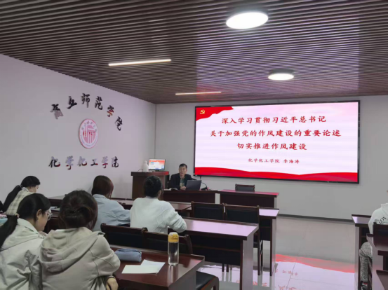 为深入学习贯彻习近平总书记关于加强党的作风建设的重要论述,切实推进学院作风建设常态化长效化,11月1日,化学化工学院分党校第57期入党积极分子培训第一讲在工科实训大楼B-309会议室进行。本次党课由学院党委书记李海涛主讲,全体入党积极分子参加学习。