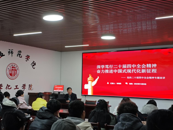 为学习好贯彻好党的二十届四中全会精神,根据学校党委《关于印发〈关于做好学习贯彻党的二十届四中全会精神宣讲工作方案〉的通知》和《关于做好党的二十届四中全会精神学习宣传的通知》要求,12月5日,化学化工学院在工科实训大楼B-309会议室举行党的二十届四中全会精神专题学习宣讲活动。本次宣讲由学院党委书记李海涛主讲,全体学生党员及入党积极分子参加学习。