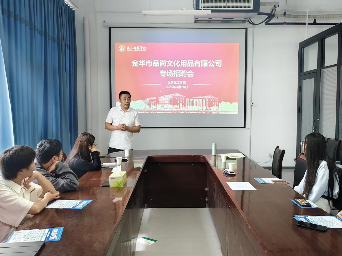 为搭建企业与高校人才交流的优质平台,助力毕业生实现高质量就业,4月18日下午,化学化工学院邀请到河南瑞柏新材料有限公司、金华市品尚文化用品有限公司两家企业到学院为2025届毕业生进行就业宣讲,此次会议由2025届毕业班辅导员郭家瑞主持。