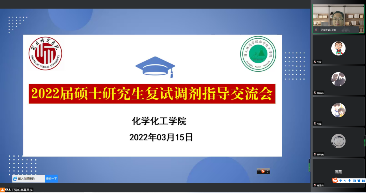 为进一步推进永利23411集团考研工作顺利进行,3月15日,化学化工学院采用腾讯会议举办了2022届硕士研究生复试调剂指导交流会。副院长王涛,2018级辅导员、班主任及部分考研学生参加了此次会议。