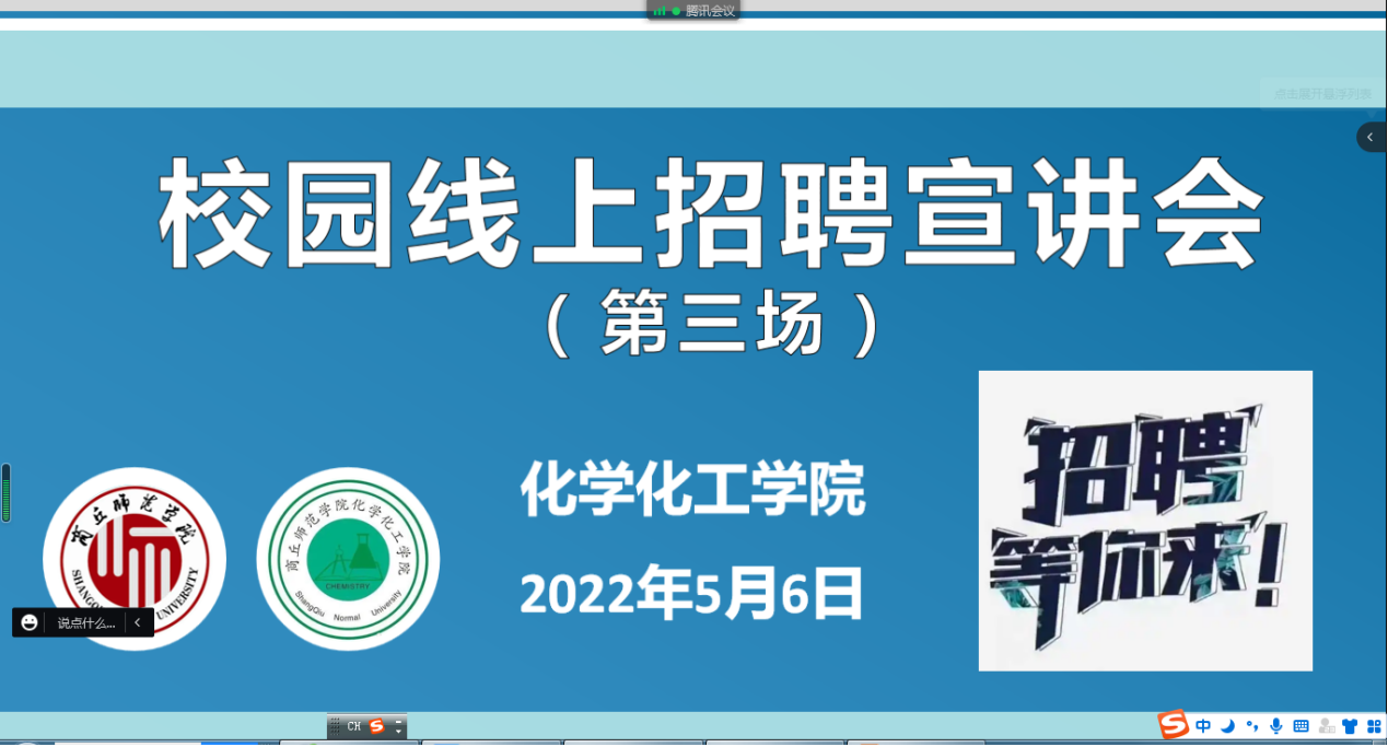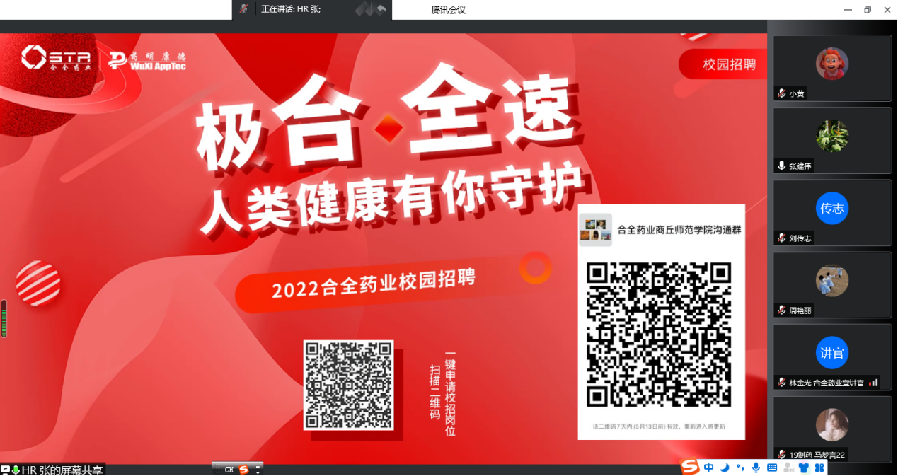 为更好的促进2022届预毕业生就业,5月6日,化学化工学院利用腾讯会议举办了校园线上招聘宣讲会(第三场)。药明康德常州合全药业、浙江朗华制药有限公司和北京民康百草医药科技有限公司参加线上招聘宣讲。
