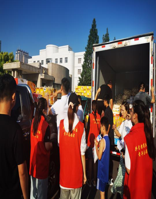7月25日,团队成员李月盈前往河南省商丘市参加物资捐赠运输志愿活动,旨在为救灾出一份力,带动更多人参与援助工作。她作为一名青年志愿者,与当地居民一起搬运方便面、矿泉水、馒头等其他生活必需品。送去的不仅是物资,更是一份信念,一份全国人民团结一心,共克难关的信念。