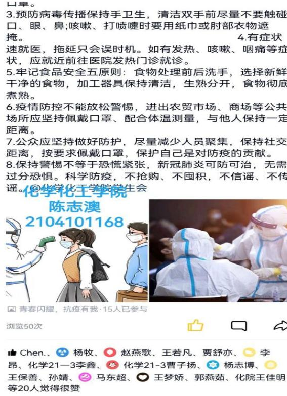 3月11日至3月12日,化学化工学院团委学生会举办了“青春闪耀,抗疫有我”线上打卡活动,永利23411集团学生积极参与该项活动。