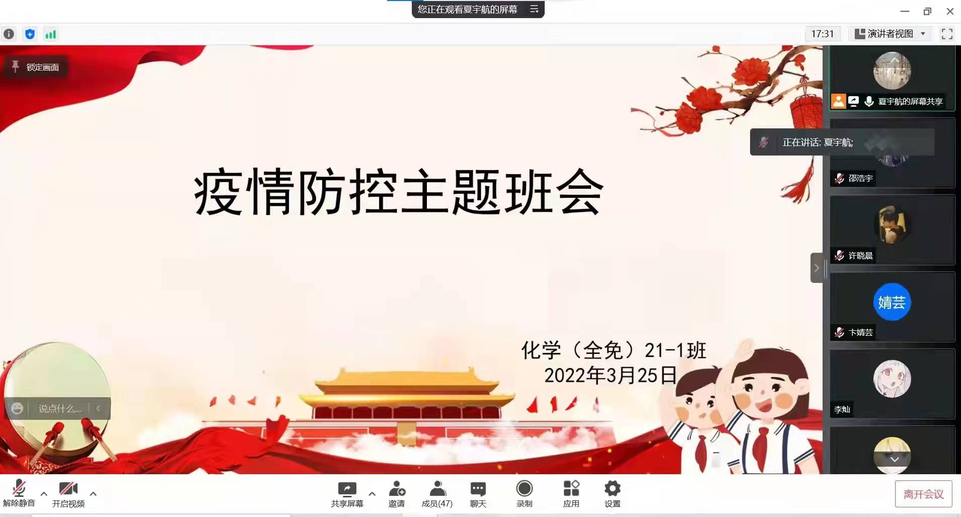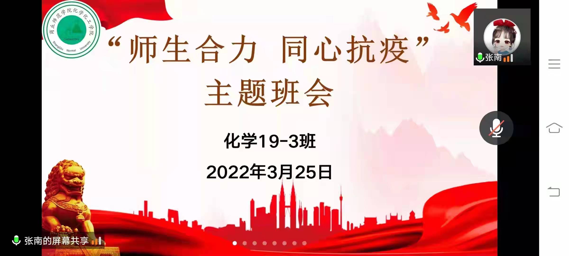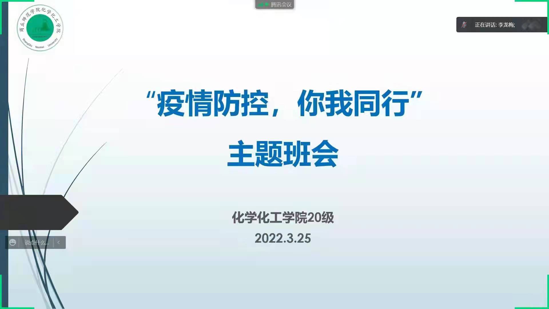 为贯彻落实学校疫情防控工作会议精神,从严从细从实做好学院疫情防控工作,筑牢广大学生疫情防控思想防线,3月25日,化学化工学院各年级分别召开了疫情防控线上主题班会,会议由各辅导员、班主任主持。