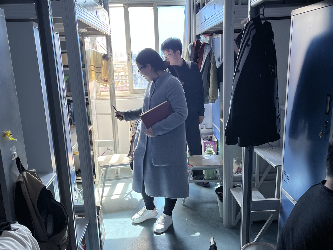 师生们对全体宿舍分组进行检查,检查的重点是用电安全、卫生状况及物品摆放,并对安全隐患及卫生死角进行排查。通过检查发现,大多数宿舍干净整洁,但仍有部分宿舍存在私拉电线、桌面杂乱、地面脏乱、生活物品摆放不整齐等现象。张颜梅对宿舍卫生状况良好的宿舍进行鼓励,对脏乱宿舍及时提出整改建议,叮嘱他们重视寝室安全卫生,合力营造一个安全、健康、温馨的住宿环境。