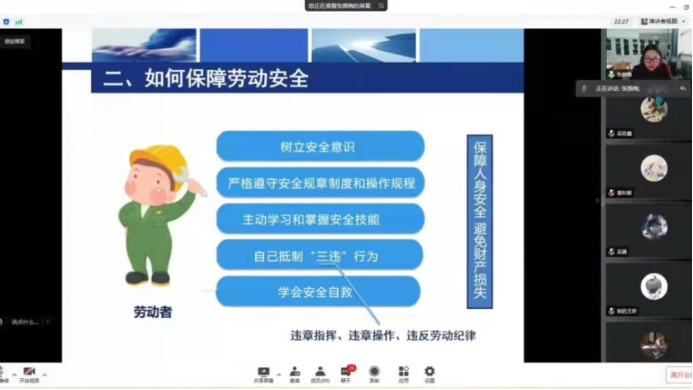 为进一步加强学生对劳动安全的理解,增强劳动安全意识。3月17日,化学化工学院通过腾讯会议开展了大学生与劳动安全线上主题讲座。主讲人为院党委副书记张颜梅。19级、20级全体班委和宿舍长参加此次讲座。