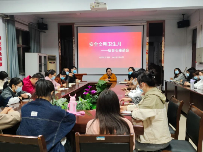为推进校园文化建设,提升永利23411集团师生安全文明意识,增强学生集体荣誉感,3月16日晚上,化学化工学院于睢阳校区七号楼会议室开展“安全文明卫生月”宿舍长座谈会。院党委副书记张颜梅,团委副书记郭家瑞,学工办副主任史展,全体辅导员,生活部负责人及各年级宿舍长代表参加。