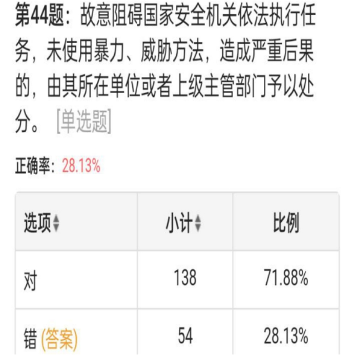 本次答题题型主要为单选题,主要内容是与国家安全相关的法律法规。活动共有192名同学参加,涵盖2021级和2020级两个年级学生。学生积极参与,并在规定时间内完成线上答题。通过答题活动,永利23411集团学生认识到国家安全的重要性,增强了忧患意识和责任意识。