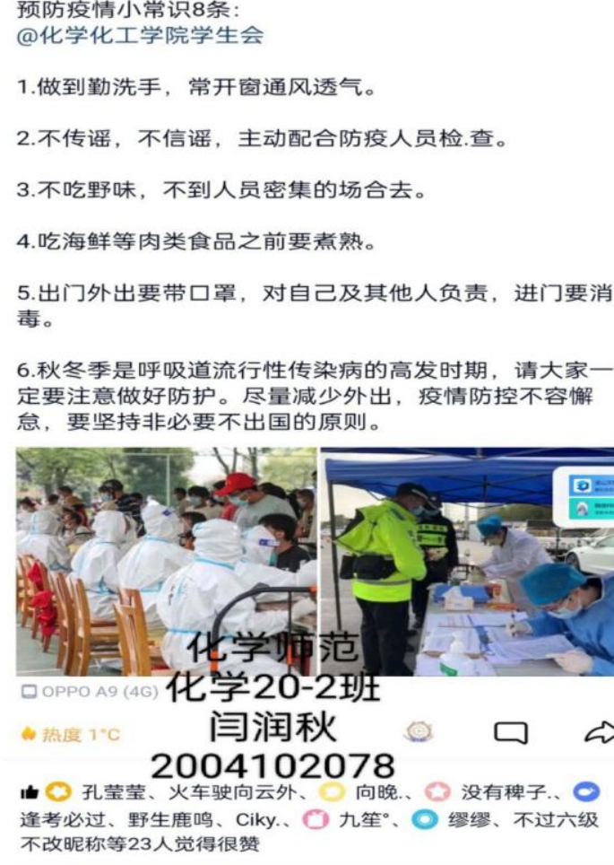 3月11日至3月12日,化学化工学院团委学生会举办了“青春闪耀,抗疫有我”线上打卡活动,永利23411集团学生积极参与该项活动。