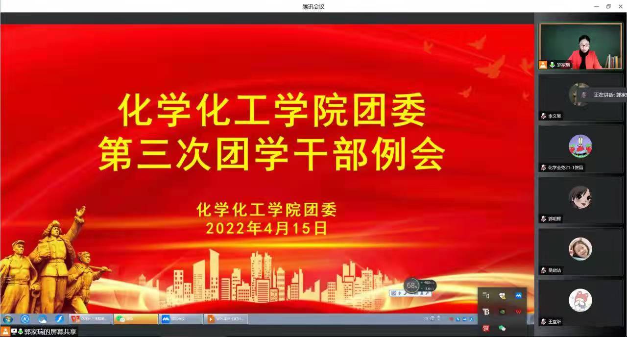 为了解近期学院团委学生会各部门的工作情况,解决工作中存在的问题,并对下一步工作进行具体安排,4月15日,化学化工学院通过腾讯会议召开了第三次团学干部例会。此次会议由团委副书记郭家瑞主持,院团委、学生会各部负责人以及各团支部书记参加会议。