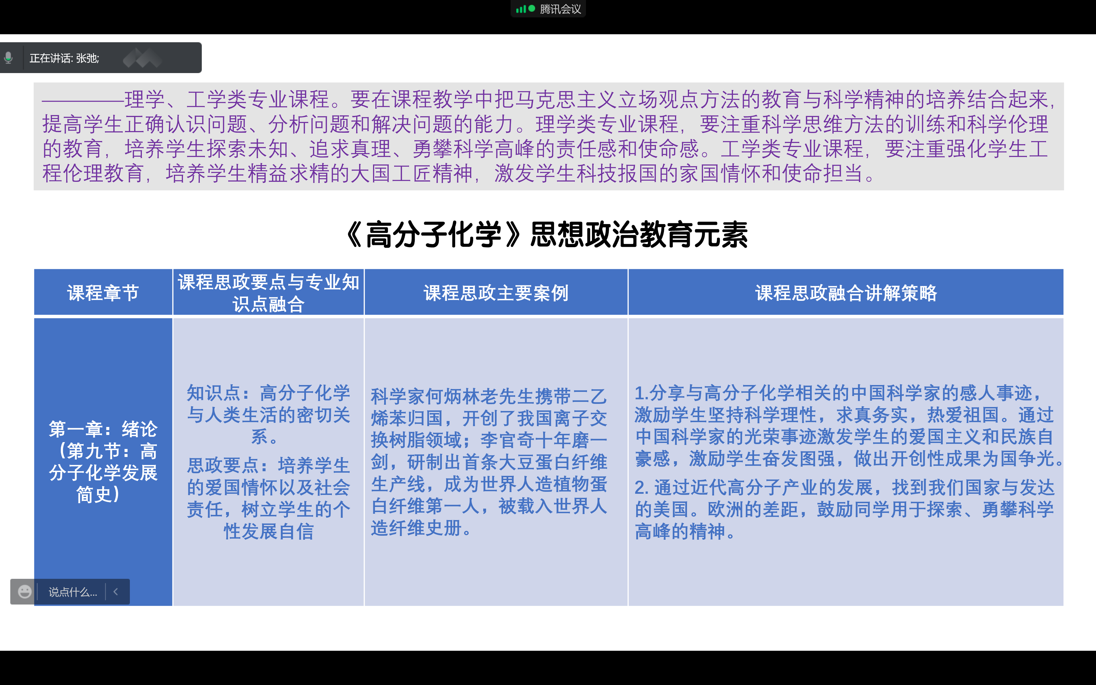 10月15日,化学化工学院材料系利用腾讯会议在线召开了“如何在专业课程中有机融入思政元素”主题教研活动。教研活动由系主任张弛主持,材料系全体老师参加了此次活动。