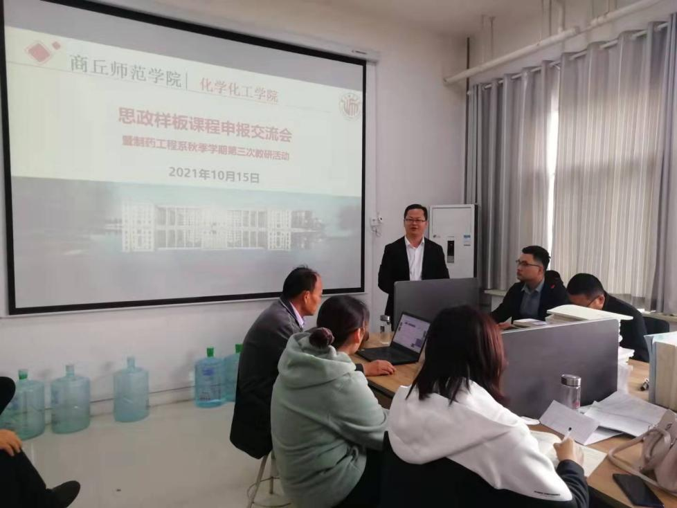 为深入贯彻落实全国高校思想政治工作会议精神,落实高校立德树人根本任务,切实推进本科高校课程思政教育教学工作和课程思政项目建设,10月15日,制药工程系在化学实验楼416室召开了以“思政样板课程申报交流会”为主题的教研活动。本次教研活动由化学化工学院副院长、制药工程系主任王涛主持,制药工程系全体老师参加。