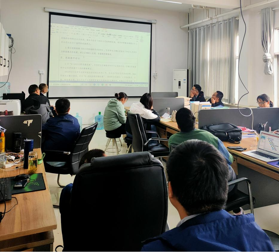 王涛指出课程思政建设是近期教学工作的一项重要内容,任课教师要在思政元素融入课程大纲,思政元素融入教案,思政元素融于PPT,思政元素融入课堂教学四个方面下功夫,打造全员、全方位、全过程育人模式。