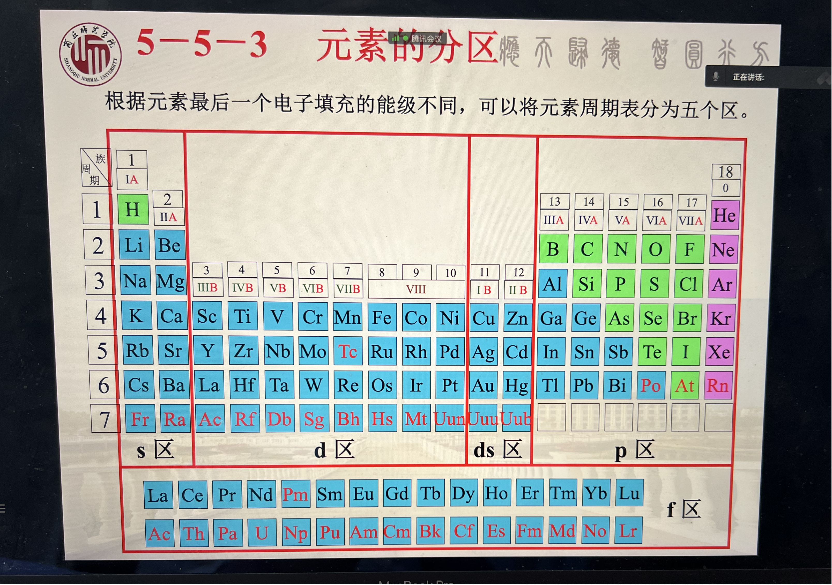 贾老师首先回顾了上节课的内容“5.4核外电子的排布”,通过提问和相关练习题来检查学生对该章节重要知识点的掌握情况。接着,贾老师通过元素周期表的发展历程,引出了本节课的主题“5.5元素周期表”。随后,贾老师采用翻转课堂范式改革教学模式,由五位学生主讲人就元素的周期、元素的族、元素的分区、徐光宪院士事迹介绍等方面展开详细讲解。同学们积极参与到课堂上来,提高了学习效率。最后贾老师通过练习题来判断学生对课堂内容的理解程度,根据学生的课堂反馈进一步调整讲课思路和讲课方式。整个教学过程由浅入深,循序渐进,课堂气氛轻松愉快。