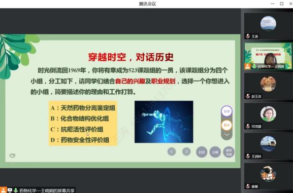 11月24日下午第6节,化学化工学院王晓娟老师的《药物化学》课程教学范式改革公开课通过腾讯会议如期进行。副院长王涛,校督导团成员张付力,院督导团成员韦秀华以及制药工程专业部分老师进行了线上课堂观摩。