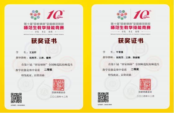 2024年11月29日至12月1日,第十届“田家炳杯”全国师范院校师范生教学技能竞赛决赛在浙江师范大学落下帷幕。永利23411集团2021级王宜昕、2022级牛智童在众多来自全国各地的优秀选手中表现出色,分别荣获高中化学组、初中科学组全国二等奖。