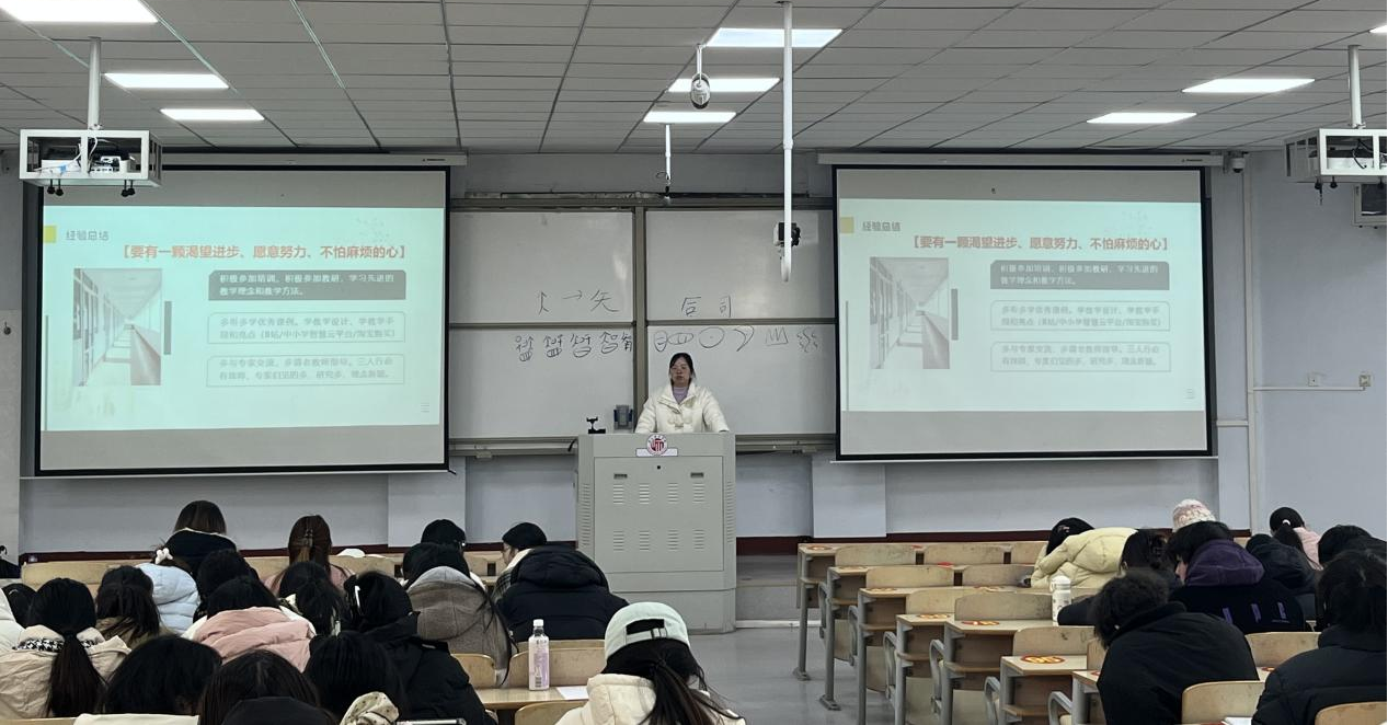 张老师以《如何上好微型课》为题开展了专题讲座。她指出,教学设计是课堂教学的蓝图与灵魂,而优秀的教学设计需实现“三个统一”:一是课标与教学的统一,确保不偏离教学“指挥棒”;二是学情与教法的统一,做到不脱离“学习者”实际;三是学科与生活的统一,让课堂不失“烟火气”。随后,张老师围绕微型课的定义、特点、各环节设计及讲授技巧展开具体阐述,并结合自身备赛时的微型课教学案例,与同学们分享了提升微型课教学表现力的方法。