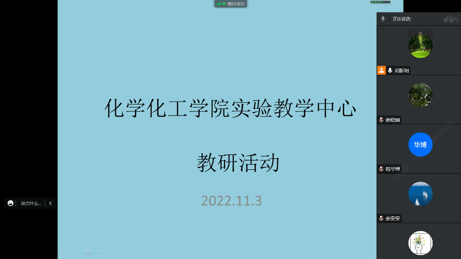 为了进一步提升全体实验员老师辅助实验教学的专业技能,保证实验教学的安全顺利进行,根据学校和学院的工作部署,11月3日,化学实验教学中心线上召开了2022年秋季学期第四次教研活动。活动由中心主任刘新明主持,中心全体老师参加。