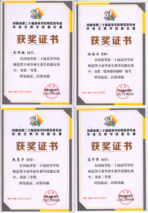 6月26日,河南省教育厅发布了《关于公布第二十届高等学校师范类专业毕业生教学技能比赛结果的通知》(教师〔2023〕209号),永利23411集团朱丽敏同学获得一等奖,张慧宇、高梦思同学获得三等奖,徐海云老师获得“优秀指导教师”奖。