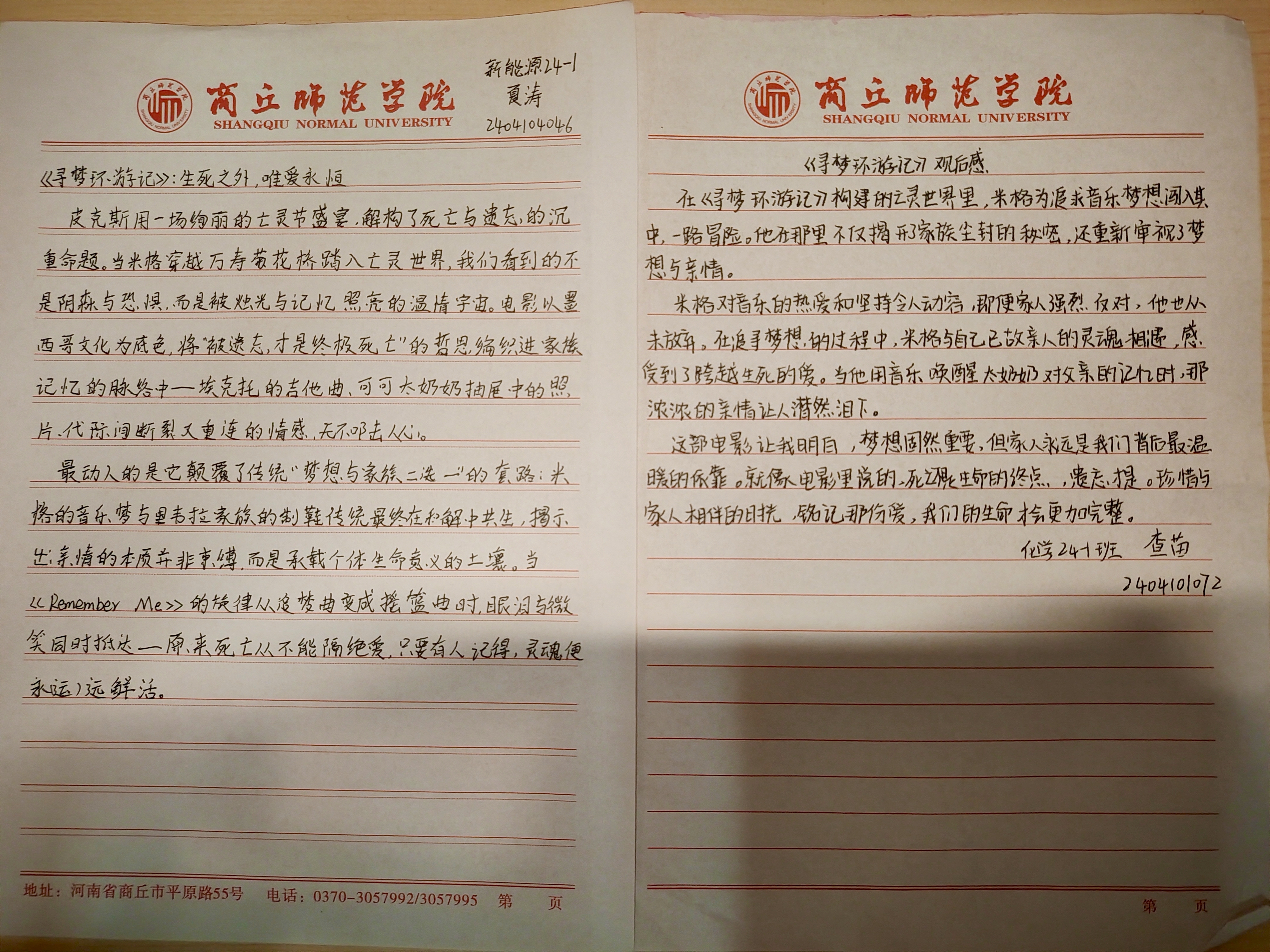 此次观看的影片是皮克斯经典动画《寻梦环游记》。影片以墨西哥亡灵节为背景,讲述了热爱音乐的小男孩米格,在追求音乐梦想的道路上,意外穿越到亡灵世界,从而揭开家族尘封往事的故事。同学们完全沉浸在米格的奇妙冒险里,并从他的冒险故事中深刻感受到亲情的珍贵与力量。观影结束后,同学们纷纷写下观后感,分享了自己对梦想、亲情以及生命意义的新理解。