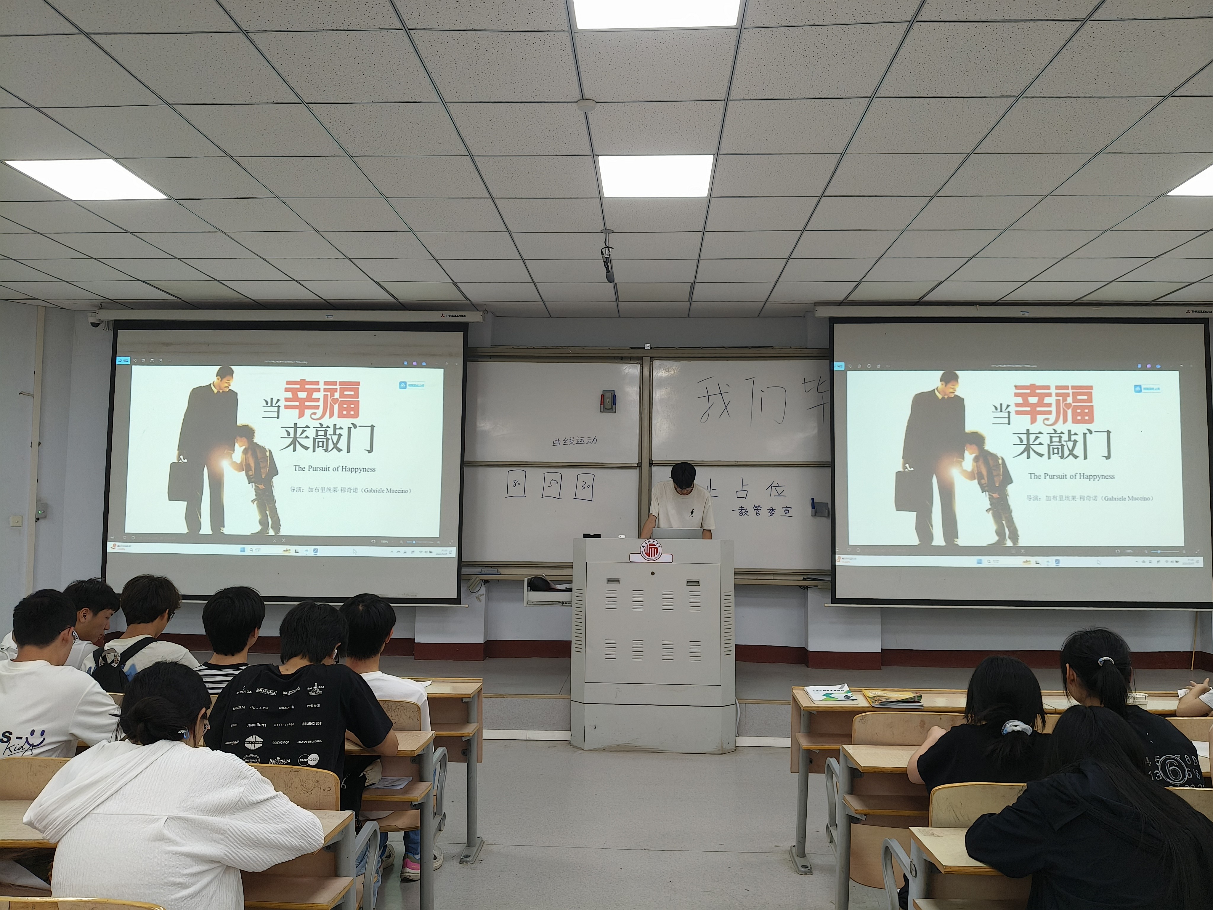 本次活动放映的影片是《当幸福来敲门》。该影片改编自真实故事,生动展现了主角在濒临破产、生活陷入重重困境时,依然坚守梦想,带着儿子顽强拼搏,最终冲破命运枷锁、实现人生蜕变的感人历程。影片中,主角在公厕过夜的窘迫、街头狼狈奔跑的场景以及成功后激动落泪的画面,深深触动了在场每一位同学的心灵,教室里不时传来阵阵感慨。