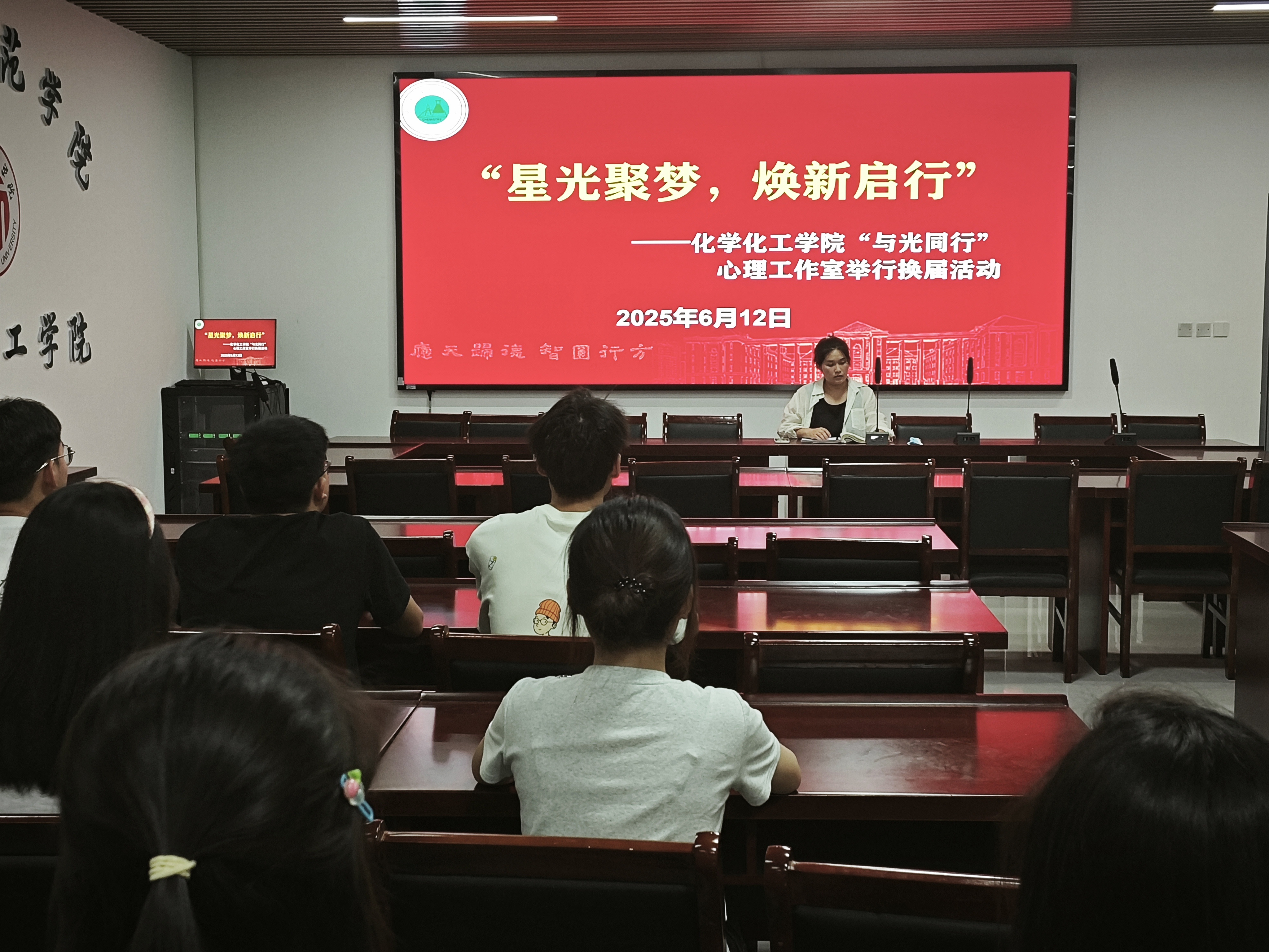 6月12日,化学化工学院“与光同行”心理工作室于工科实训大楼B309会议室举行“星光聚梦,焕新启行”换届活动。活动由心理部成员卢海波主持,心理专员李宁娅出席活动,工作室全体成员参加。